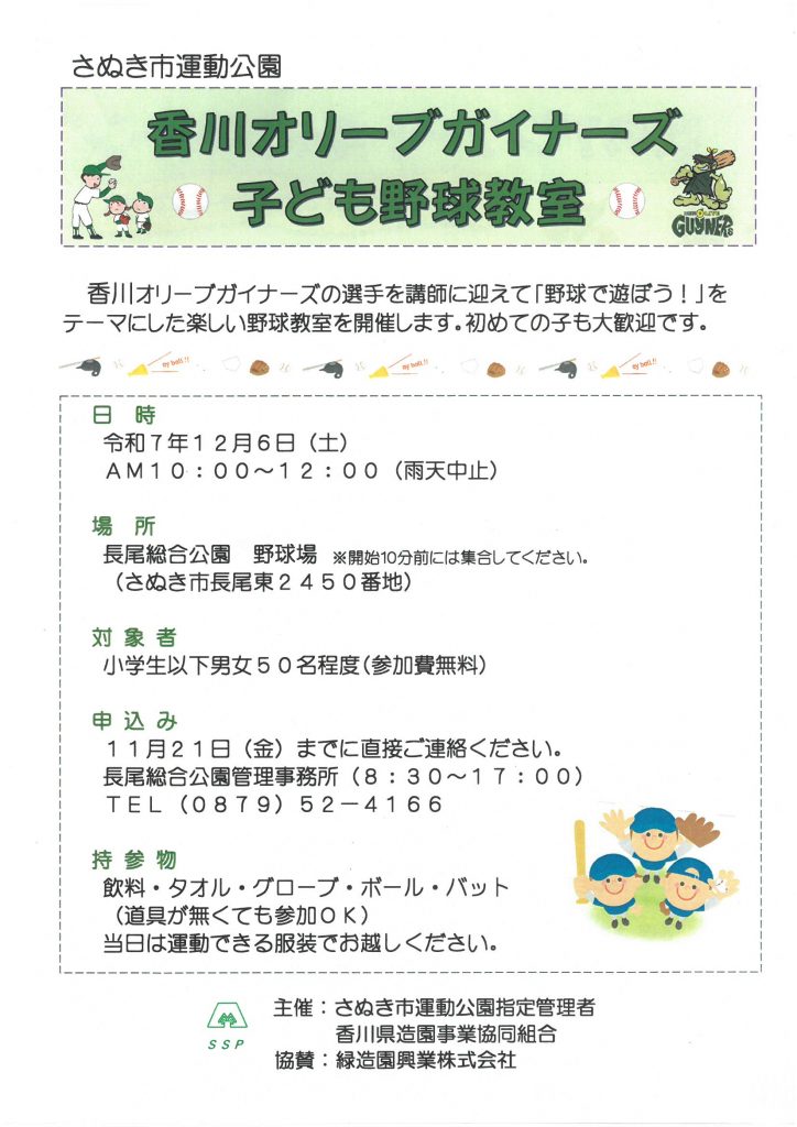 香川オリーブガイナーズの選手を講師に迎え、「野球で遊ぼう!」をテーマにした楽しい野球教室を開催します⚾