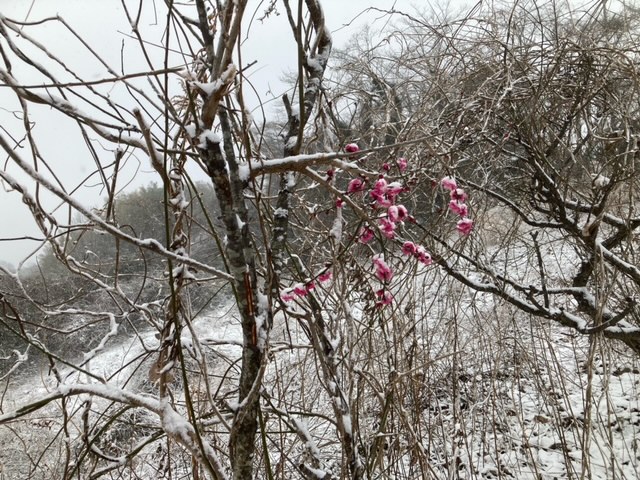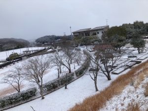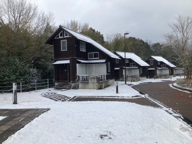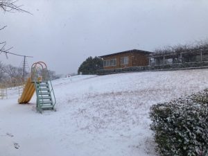 雪化粧をしたコテージやグラウンド、うっすらと雪をまとった遊具や梅の木。梅の花は、寒さの中でも少しずつ咲き始めていました。