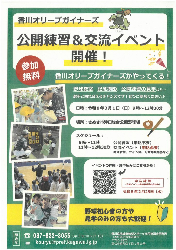 津田総合公園にプロ野球独立リーグ「香川オリーブガイナーズ」の選手たちが来園します。